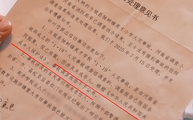 ▲当地政府给遇难学生家属的书面答复。图片/上海广播电视台《看新闻》 ►本文首发于今日头条,为新京报原创稿件。未经许可禁止转载。河南南阳方城县英才学校火灾至今已过去近两年时间,遇难者家长仍苦苦寻求一个明确的“说法”。据上海广播电视台《看看新闻》报道,2024年1月19日深夜,河南省方城县独树镇燕山铺村英才学校宿舍发生火灾。事故造成13人死亡、4人受伤,这些孩子的平均年龄只有9岁。事故发生后,寄宿学校被勒令停止运营。然而,造成13名学生死亡的重大安全事故的悔罪过程却遭遇“法院延期”等困难。多次开庭”、“调查报告难以公开”等,当地有关部门以“涉及未成年人”为理由,不让调查报告出炉,表面上看似“保护”未成年人,实则背离了法治正当程序,走向了保护未成年人的反面。法治社会的根基在于权利保障的平等性和救济渠道的畅通。当未成年人的最高法定利益——生命权得到保障时,受到侵害,首先要充分保障的是公众的知情权和受害人家属的知情权。重大事故的发生,当然包括对未成年人的保护,但这种保护不应该简单地等同于封锁信息,而应该通过信息公开来推动安全体系的完善,防止类似悲剧重演。在校园安全管理体系中。作为寄宿学校,必须严格执行《校园宿舍安全管理制度》,包括24小时值班制度、定期火灾隐患检查等严格要求。火灾的发生以及后续应对不当表明安全管理责任没有落实。法治的本质是通过制度预防悲剧发生,而不是事后解决悲剧。当安全管理从形式检查转变为重大监督悲剧就可以避免再次发生。从法律角度看,事故调查报告具有特殊的法律地位。许多法律法规为事故调查中的信息披露提供了明确的依据。特别是,对于“涉及特定对象权利义务、需要特定对象认可的政府信息”,必须向特定对象进行通报或查询服务必须提供。这意味着,即使事故调查信息因涉及未成年人而不宜完全向公众披露,也应该向特定目标传达——尤其是遇难学生的家长。 “涉案未成年人”并不能成为拒绝披露事故调查报告的绝对理由。在法治实践中,有各种信息处理技术可以在保障公众知情权的同时保护相关当事人的隐私。例如,最高法院在司法文书网公开的司法文书中不识别未成年人的身份信息,这既保护了隐私,又保证了法律程序的透明度。对于校园火灾等安全事故,完全有可能在调查报告中隐藏死亡学生的具体身份信息,同时公开事故原因。事故原因、责任认定和安全。漏洞及修正建议等关键内容。事故调查信息的不透明会造成一系列负面后果。信息真空很容易滋生谣言,加剧公众的疑虑和不信任。从法治建设的角度来看,事故调查过程缺乏透明度,会削弱司法公信力,影响公平正义的实现。当公众质疑安全事故调查的公正性时,法治社会的根基就会受到侵蚀。每一次重大安全事件都应该是提升安全管理的契机,而这一目标的实现有赖于调查结果的适当披露和共享。这种透明度不仅会损害未成年人的权利,而且有利于提高整个社会的安全保障。阳光是最好的防腐剂,真相是最有效的安慰剂。面对每一起悲剧,只有让真相战胜谣言,让法治的阳光照亮事故调查的每一个角落,让正义得到看得见的伸张,才能有效筑起保护未成年人的坚固防线。撰稿/王仁林(法学学者)主编/马小龙/张彦军校对